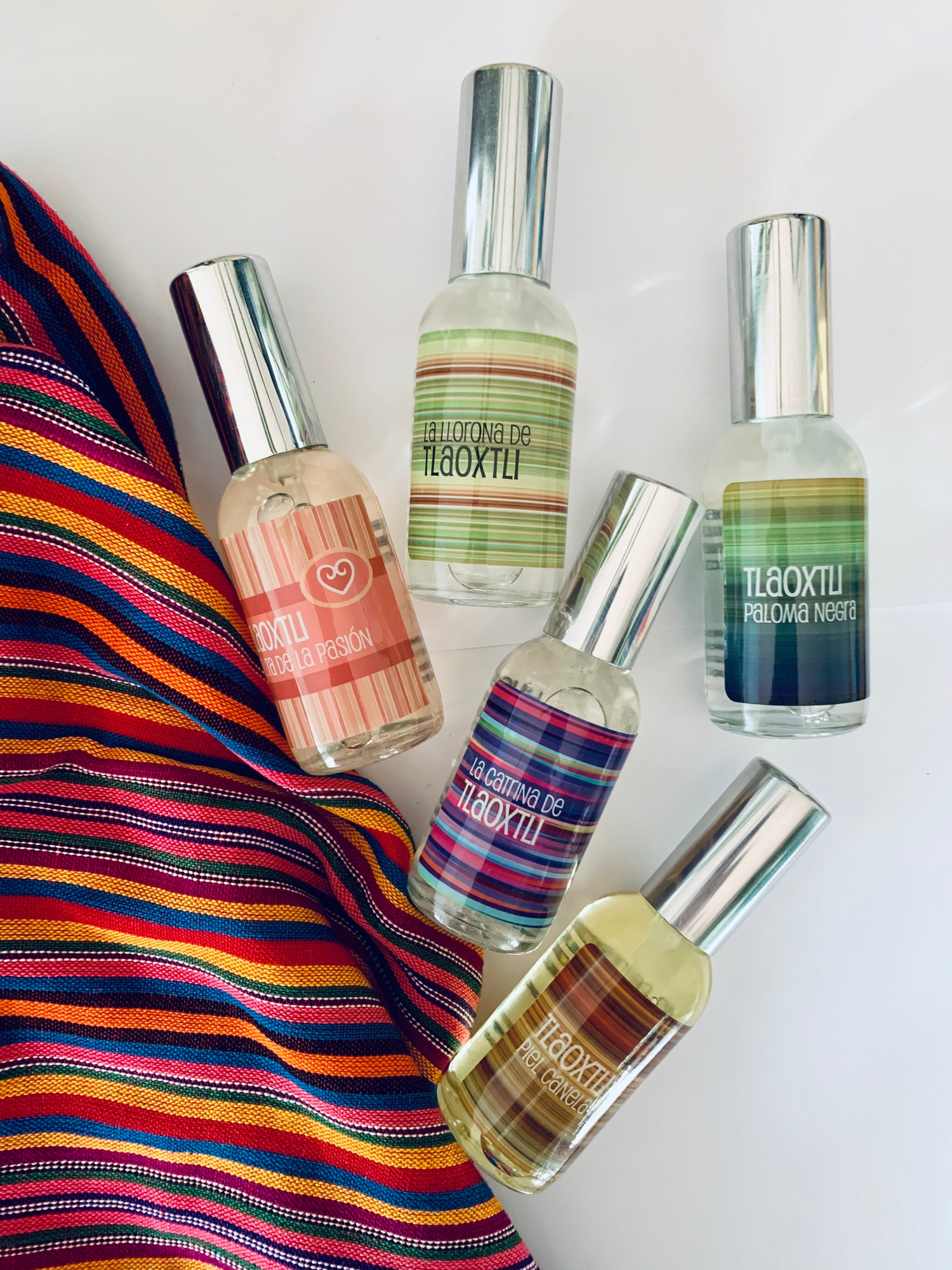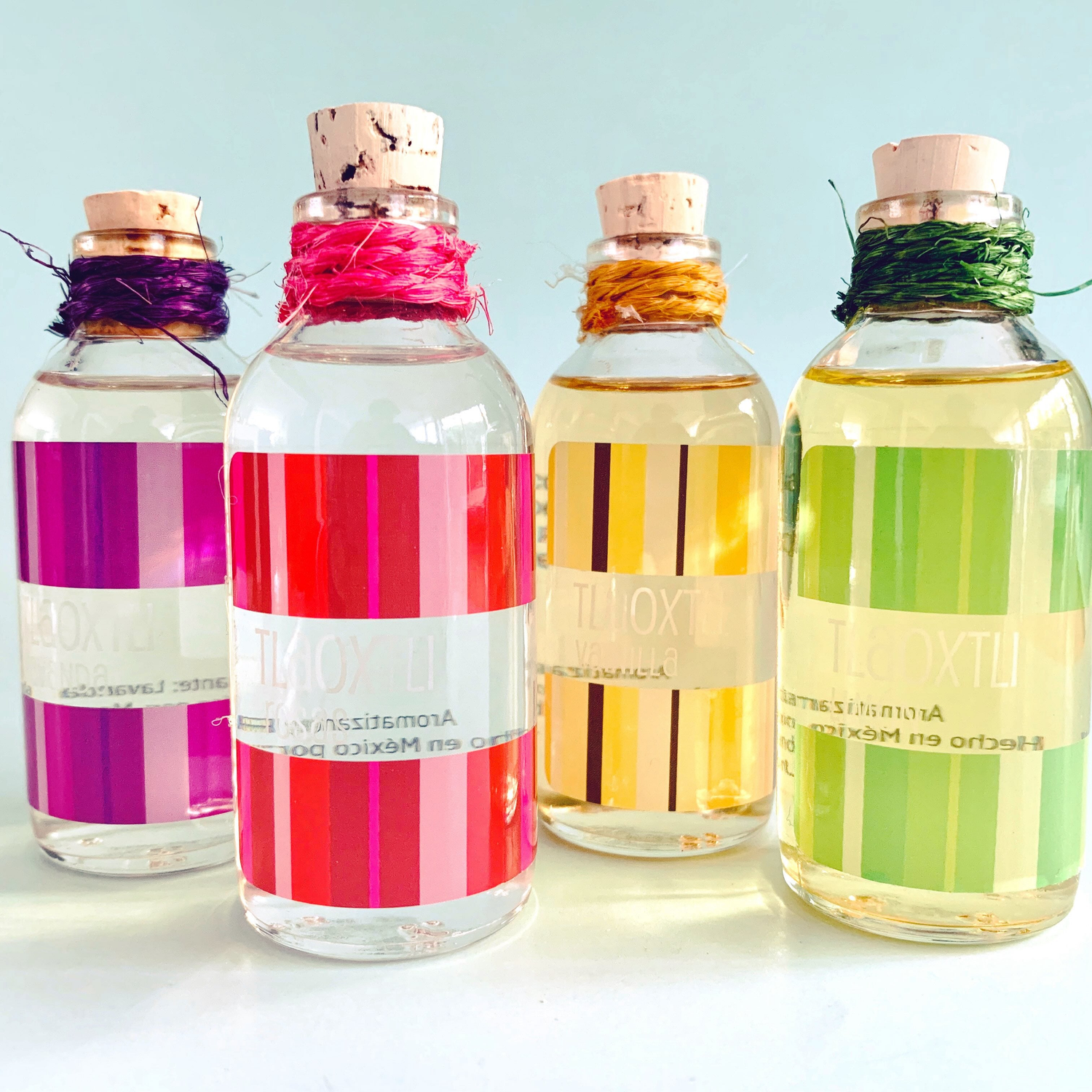 Todos están inspirados en los colores y en las tradiciones de nuestro país, pero sobre todo por el amor, admiración y respeto que sentimos de ser mexicanos. Cada una de las botellitas, tanto de fragancia fina como aromatizantes, están elaboradas artesanalmente; todo el proceso de fabricación, mezcla, llenado, etiquetado, moños, mecate, etc. están ensamblados a mano. Por ello, cada vez que compras una botellita, te estarás llevando un pedacito de nuestro trabajo, tiempo y amor.